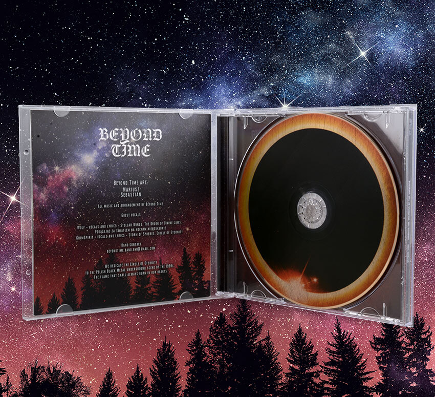 BEYOND TIME - Through the Vastness of the Universe – a majestic journey through cosmic realms where atmospheric black metal meets astral grandeur. This debut album from the Polish duo (Sebastian of Old Leshy/Sunwhell and Mariusz, ex-Kataxu) delivers six tracks of monumental, keyboard-driven soundscapes that bridge the legendary Polish black metal scene of the 1990s with the present. Hypnotic riffs and ethereal atmospheres guide listeners through stellar voids and eternal circles, from the opening "Stellar Wings" to the closing dedication "Circle of Eternity," which honors the Polish black metal underground of the '90s. The album includes one track in Polish, "Podążając za Światłem na Nocnym Nieboskłonie," adding an authentic touch to this 45-minute cosmic voyage. Essential for fans of atmospheric black metal who yearn for the majestic, space-ambient influenced sound that defined Polish underground extremity.